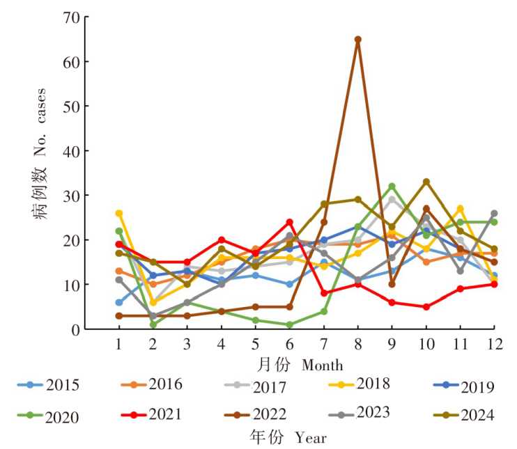 目的 分析2015—2024年广东省报告的疟疾病例流行病学特征,为进一步完善疟疾防控策略、防止疟疾输入再传播提供科学依据。 方法 在中国疾病预防控制中心的传染病和寄生虫病防治信息系统中,收集2015—2024年广东省疟疾病例的报告信息及流行病学个案调查表。采用Microsoft Excel 2016和SPSS 26.0软件统计分析感染虫种、感染来源地、三间分布特征以及就诊和诊断情况。 结果 2015—2024年广东省共报告疟疾病例1 879例,其中境外输入性病例1 871例,输血感染病例2例,长潜伏期三日疟再燃病例6例,共报告死亡病例16例。2015—2019年度报告病例数总体呈上升趋势,新型冠状病毒感染疫情期间(2020—2022年)年均报告病例数均低于平均值。经实验室确诊,恶性疟1 559例(占83.0%),2015—2024年恶性疟占比为80.4%~86.8%。1 871例输入性病例中,1 785例(占95.4%)感染地为非洲。除潮州市外均有病例报告,主要集中在珠三角地区,共报告1 680例(占89.4%,1 680/1 879)。月报告病例数为1~65例,中位数为15例/月,年度疫情高峰通常出现在6月和8-10月。病例男女性别比为8.8:1;主要集中在30~39岁组(32.5%,611/1 879)和40~49岁组(26.7%,501/1 879)。病例共由191家机构报告,78.4%(1 474/1 879)的病例在发病3 d内就诊,恶性疟病例占比最高,达79.7%(1 242/1 559)(χ² = 8.17,P < 0.01)。初次诊断即诊断为疟疾的病例占83.1%(1 562/1 879)。初诊单位为地市级以上、县(市/区)级、基层医疗卫生机构的疟疾诊断正确率分别为90.6%(1 096/1 210)、81.7%(402/492)和36.2%(64/177),差异有统计学意义(χ² = 327.04, P < 0.01)。从就诊到确诊的中位时间为1 d,86.6%(1 627/1 879)的病例在就诊3 d内确诊,恶性疟病例在3 d内确诊的比例高于其他类型(χ² = 12.44,P < 0.01)。共报告69例(占3.7%,69/1 879)重症疟疾,感染虫种均为恶性疟原虫。 结论 广东省的疟疾输入风险持续上升,恶性疟病例占比高,今后应重点加强出入境人员健康教育以及提高基层医疗机构早期诊断能力。