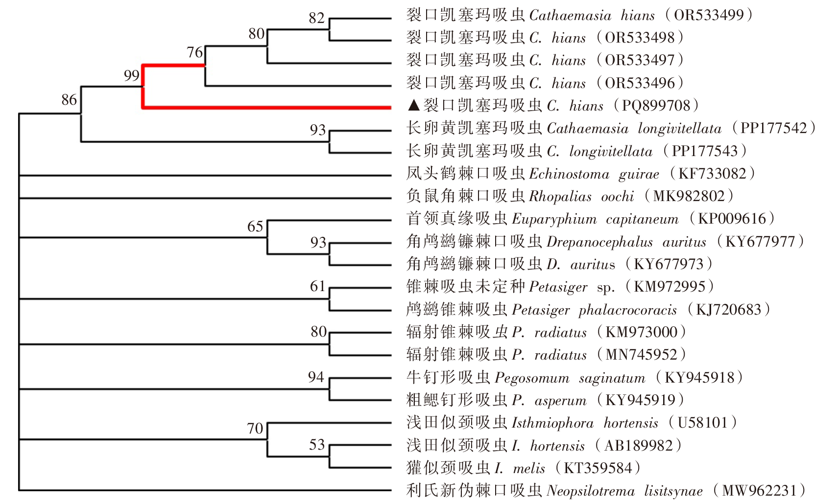 [1] | 许秀, 吴逸群. 黑鹳的生态生物学研究与保护[J]. 湖北农业科学, 2013, 52(13): 3086-3088, 3094. | | Xu X, Wu YQ. Study on protection and eco-biology of Ciconia nigra[J]. Hubei Agric Sci, 2013, 52(13): 3086-3088, 3094. (in Chinese) | [2] | Ramilo DW, Caetano I, Brazio E, et al. Presence of one ecto- and two endoparasite species of the black stork (Ciconia nigra) in Portugal[J]. BMC Vet Res, 2021, 17(1): 21. | [3] | Heneberg P, Sitko J. Molecular phylogenetics provides unequivocal support for reclassifying Cathaemasia hians longivitellata and C. h. hians (Trematoda∶Cathaemasiidae) as two valid species with different host preferences[J]. J Helminthol, 2024, 98: e76. | [4] | Juhásová ?, K?nigová A, Molnár L, et al. First record of Cathaemasia hians (Trematoda∶Cathaemasiidae) in a new bird host, the eastern imperial eagle (Aquila heliaca)[J]. Helminthologia, 2023, 60(4): 380-384. | [5] | Rudolphi KA. Entozoorum sive vermium intestinalium historia naturalis[M]. Vol 2. Amsterdam: Tabernaelibrariae et artium, 1808: 457. (in Latin) | [6] | Looss A. Weitere Beitr?gezur Kenntniss der Trematoden-Fauna Aegyptens, zugleich Versuch einer natürlichen Gliederung des Genus Distomum Retzius[J]. Zool Jahrbücher, 1899, 12: 521-784. (in German) | [7] | 赵世华, 杭福德, 常建华, 等. 黑鹳的呵欠鸟凯塞玛吸虫病[J]. 野生动物, 1990(2): 25. | | Zhao SH, Hang FD, Chang JH, et al. Black stork yawning bird kesema fluke disease[J]. Wildlife, 1990(2): 25. (in Chinese) | [8] | 孔繁瑶. 家畜寄生虫学[M]. 2版. 北京: 中国农业大学出版社, 1997: 414-417 | | Kong FY. Livestock parasitology[M]. 2nd ed. Beijing: China Agricultural University Press, 1997: 414-417. (in Chinese) | [9] | Goswami LM, Prasad PK, Tandon V, et al. Molecular characterization of Gastrodiscoides hominis (Platyhelminthes∶Trematoda∶Digenea) inferred from ITS rDNA sequence analysis[J]. Parasitol Res, 2009, 104(6): 1485-1490. | [10] | Yoshida S, Toyoda K. Notes on Cathaemasia hians (Rudolphi) from the mouth of Ciconia nigra[J]. Ann Trop Med Parasitol, 1930, 24(1): 85-94. | [11] | Liptovszky M, Majoros G, Perge E. Cathaemasia hians in a black stork (Ciconia nigra) in Hungary[J]. J Wildl Dis, 2012, 48(3): 809-811. | [12] | K?nigová A, Hr?ková G, Molnár L, et al. Cathaemasia hians infection in black stork in Slovakia: Morphological and histopathological study[J]. Helminthologia, 2015, 52(4): 316-322. | [13] | Merino S, Martinez J, Lanzarot P, et al. Cathaemasia hians (Trematoda∶Cathaemasiidae) infecting black stork nestlings (Ciconia nigra) from central Spain[J]. Avian Pathol, 2001, 30(5): 559-561. | [14] | Zhytova O, Korol E. Cathaemasia hians (Digenea, Cathaemasiidae) from Planorbis planorbis (Mollusca, Gastropoda) in reservoirs of central polissya[J]. Vestnik Zool, 2012, 46(4): 361-364. | [15] | Syrota YY, Kuzmin YI, Lyaskivskiy VN, et al. First record of Dicheilonema ciconiae (Nematoda, Diplotriaenoidea) from Ciconia nigra (Aves, Ciconiidae) in Ukraine[J]. Vestnik Zool, 2016, 50(4): 379-382. | [16] | Sitko J, Heneberg P. Composition, structure and pattern of helminth assemblages associated with central European storks (Ciconiidae)[J]. Parasitol Int, 2015, 64(2): 130-134. | [17] | Gonzálvez M, Mu?oz-Hernández C, Gómez de Ramón A, et al. Flying across Europe: The case of the spread of Chaunocephalus ferox on a black stork (Ciconia nigra)[J]. J Helminthol, 2022, 96: e80. | [8] | Caffara M, Locke SA, Gustinelli A, et al. Morphological and molecular differentiation of Clinostomum complanatum and Clinostomum marginatum (Digenea∶Clinostomidae) metacercariae and adults[J]. J Parasitol, 2011, 97(5): 884-891. |