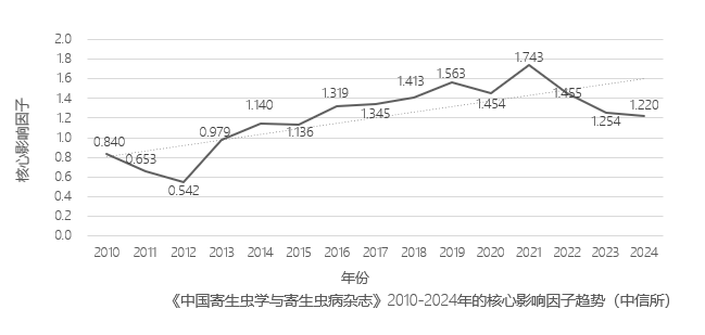 Chinese S&T papers and Citation Database (CSTPCD) was founded in 1987, and this journal was selected as a statistical source in the first year of its establishment. In 1998, Institute of Scientific and Technical Information of China published the first Chinese S&T Journal Citation reports (core edition), and Chinese Journal of Parasitology and Parasitic Diseases was selected as the Chinese S&T Core Journal. At first, Chinese S&T Core Journal was selected every two years and then selected once a year since 2013.