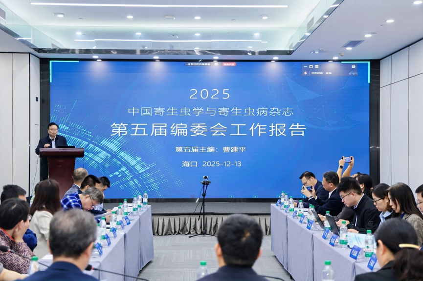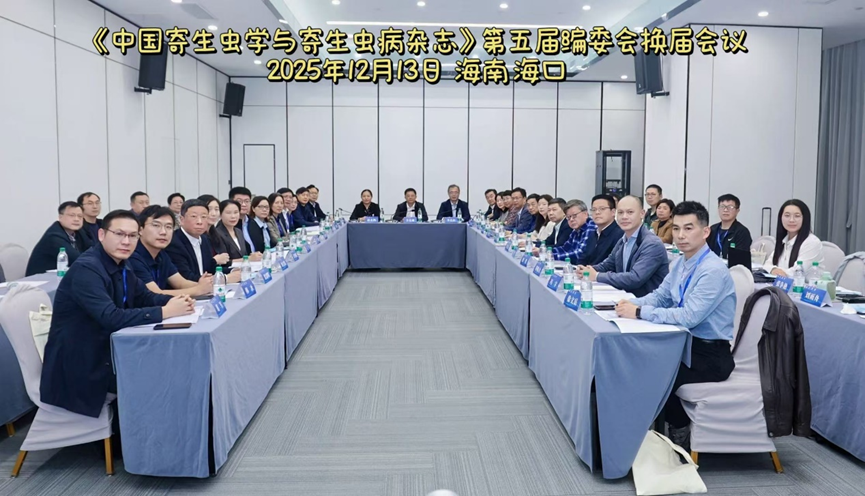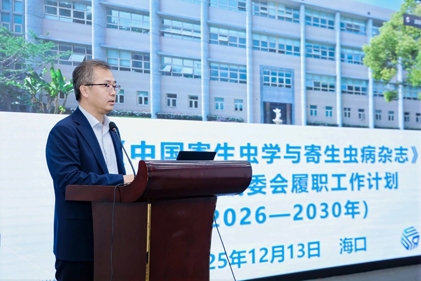 On December 13, 2025, National Institute of Parasitic Diseases, Chinese Center for Disease Control and Prevention (Chinese Center for Tropical Diseases Research) (hereinafter referred to as "NIPD") convened the handover meeting of the fifth editorial board of Chinese Journal of Parasitology and Parasitic Diseases in Haikou, Hainan. A total of 73 guests (41 offline and 32 online) attended the meeting, including Mr. Li Guanglin, Deputy Secretary-General of Chinese Preventive Medicine Association; Mrs. Zhao Chihong, Director, Department of Academic Publishing Management, Chinese Center for Disease Control and Prevention; Dr. Li Shizhu, Director of NIPD; members of the sixth editorial board; and editorial staff. The meeting was hosted by Dr. Zheng Bin, Deputy Director of NIPD.